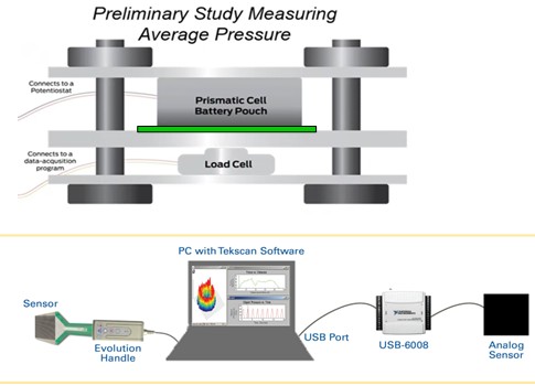 バッテリーの荷重試験は、数時間~数日の長時間実行し、-10℃~100℃まで温度変化させます。これら環境は樹脂フィルムセンサーの精度を低下させます。また、ラミネートセルに荷重を長時間加えると硬化する為、センサー感度を著しく変化させます。そこで、加圧アクチュエータ(室温)にロードセルを設置しフィルムセンサー誤差を補正する事によって高精度の面圧分布計測を可能にします。