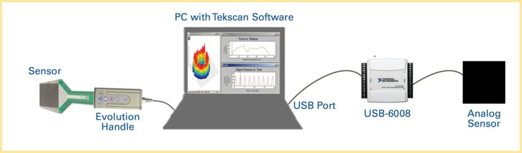 ノートパソコンにフィルムセンサーとUSB-6008を経由してロードセルを接続し同期計測します。