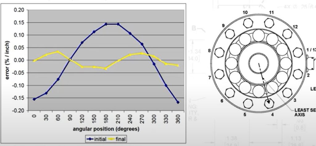 ***工場出荷時には定格荷重100%(1000シリーズの場合)を全周に渡って掛け、モーメント誤差が定格容量の±0.10%(以下表最右列_1000 Series)になるよう検査、微調整加工している。